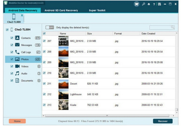 5. Cukup tunggu hingga beberapa menit untuk menyelesaikan proses scanning terhadap file yang hilang di android. Apabila sudah selesai maka anda bisa melihat file yang sudah dipulihkan tersebut.